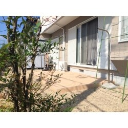 既存の土間を利用して、タイルテラスを作りました。残りの部分は防草シートと砂利でローメンテナンスのお庭に生まれかわりました。