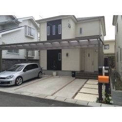 一部コンクリートを解体して仕上げを変えてアプローチに。外構工事と一緒にお庭も全体的に工事させて頂きました。玄関から車まで濡れずに行ける敷地いっぱいに広がる3台用のカーポート!存在感がありますね。雨の日は大活躍です。門柱もご希望の場所へ移動させ可愛いオレンジのポストがアクセントになっています。