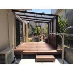 目隠しを兼ねた洗濯干し場をご提案させて頂いてます。使用している商品はテラス屋根「SMALE」腰パネル付きです。柔らかい木目の色合いが緑との相性も良く、圧迫感無く目隠しをしてくれています。木樹脂デッキには、オプションでお子さんの転落防止のための柵をつけています。