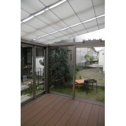 サンルームを施工させていただきました。出入り口が雨で濡れないよう、サンルームと連結させて持ち出しのテラス屋根を取り付けています。