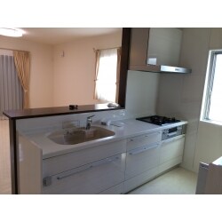 動線の良い対面式システムキッチン、昇降式式吊戸棚、シンク下収納で収納スペースも確保し、リビングから続く床はフロアタイルで仕上げ手入れもしやすく。