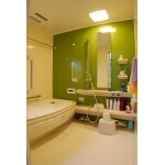 お風呂は2世帯共有。ユニットバスにしたことで、浴槽が広くなり、断熱性も大幅アップしました。 2か所あった窓を1か所にしたことで、収納をたっぷりとれました。浴室換気暖房乾燥機を取り付けたので湿気対策もバッチリです。