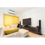 購入する家具をあらかじめ決めて頂いて、それに合わせて壁の下地補強、コンセントの位置などを設計しました。 せっかくリフォームをしたのに、スピーカーの配線などが床を這っていては残念極まりないですね、ということで、あらかじめ、スピーカーを置く位置を決めて、そこにピンポイントで配線を通し、スピーカーを置くとすっきり、配線が見えないようなご提案をさせて頂きました。 テレビ台の下には間接照明も取り付けてあります。夜は間接照明のやわらかな明かりのみで過ごすことが多いそうです。