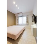 ベッドルームにもキッチンと同じベージュの壁紙でアクセントを。ウォークインクローゼットの設置。