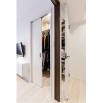 寝室、廊下からの2方向アクセスで、奥様・ご主人様のどちらかが朝早くても、起こすことなく身支度が可能。扉が集中しますので、クローゼットの扉はホワイトにして圧迫感を軽減、クロスとなじませました。
