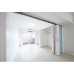 間仕切り扉には彩光を得るようすりガラスの面積の大きな建具をご提案。 壁一面に開閉する扉とし、大きな空間と個室空間を両立させています。 全面的にホワイト色の仕上げとして、光の乱反射の効果をつくりました。