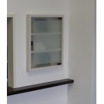 メディシンボックスをつくりたいとのご要望で、壁の厚みを利用した埋め込み型をご提案。ベージュ系の塗装にすりガラスを採用し、ラグジュアリー感のある落ち着いたインテリアに馴染む。