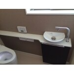 すっきりとしたタンクレストイレに、床は防水CF、壁には防水クロスを張り、お洒落な手洗いも設けました。