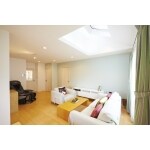 吹き抜けとトップライトで明るさ・空間の広がりを確保したLDK