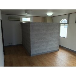 壁・天井はクロス貼替え。床は安価で丈夫なフロアタイル貼りをご提案させて頂きました。あと事務スペースも作りたいとのことでしたので、仕切り壁を設置してスペースを確保しました。