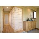 天井迄の障子が、閉めればプライバシーの確保、開ければリビングに居ながら3方向の花が眺めるプランにしました。収納は奥行を短かくして収納性をアップ。又、廊下の障子をオープンにして広いリビングとしての活用も出来るようになりました。