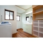 施主支給の収納ボックスに合う様、収納棚を作成。洗面所にも床暖設置