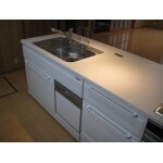 L型のキッチンを対面式のシステムキッチンに変更し、吊戸棚もなくし広いリビングにしました。