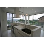 対面キッチンから素敵な景色が眺められます。 白い解放感のあるキッチン。。 美味しい料理と楽しい家族の会話が聞こえそうです。