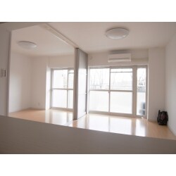 LDKと和室の間仕切り壁を減らして広々した空間に。 LIXIL「インプラス」を利用したインナーサッシで断熱、遮熱、結露防止、防音効果を。 ホワイトの建具と壁紙が光を反射して明るい空間に。