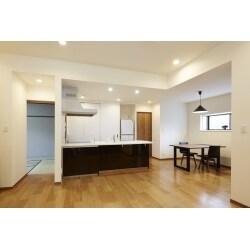 キッチンの位置を大きく変え、住まいの中心に。キッチンにそって回遊動線を作る間取りに変更しました。 回遊動線を作ることで、家事動線が快適なのはもちろん、まだ小さなお子様にとっては自由に遊び回れるようになりました。