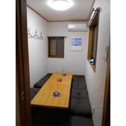 店舗の中の別室です。 4帖半という限られたスペースの中で、お客様がたくさん入れるようにと、掘りごたつを設け、ゆったりと腰を掛けれるようにしました。 お手持ちのテーブルの脚を取り外し、折り畳みができる短い脚を取り付け、テーブルは邪魔な時には収納できるようにいたしました。 床には既存のフローリングの上に掘りごたつの中にも畳柄のタイルカーペットを敷き、天井と壁には少し落ち着いた和風柄のクロスを貼ることにより、落ちついた空間となりました。