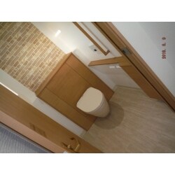 TOTOレストパルFを設置。 後ろのカウンターは収納にもなっているのでトイレットペーパーも掃除用具もスッキリ収納できます。便器が床から浮いてる!?のでお掃除もラクラクです。暖かいトーンの内装で寒さも感じさせないはず!
