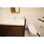 無駄に長い洗面台を半分にし、その横に便器を設置するレイアウトに変更し、洗面台本体やミラーは、現在なかなか出まわっていないデザインなので、愛着のあるものたちを現代風に活かしたプランをご提案しました。
