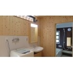 部屋全体を吸放湿性のある板壁としました。洗濯機と洗面台の廻りは防水パネルを貼りました。また換気用の高窓 (オペレーターチェーン付)も設けました。