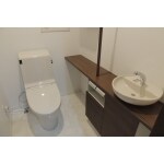 間取り変更により、3尺から4.5尺間口の広々トイレに! 立派な手洗い器を設置し、収納もたっぷり。エコカラットでいつも清潔感のある素敵なトイレ空間に。 床材には水に強い石目柄鏡面仕上げのフローリングを使用。 お掃除の手間は変わらないのに高級感がぐっとアップするので、トイレ改装にお勧めのフローリングです。