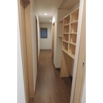 使用頻度の高い掃除機などのお掃除グッズ、家族で使うものなどをしまえる共用収納スペースを廊下に作りました。ここは1.25坪の浴室の裏側に出来た空きスペースを有効活用したものです。 オープンにして出し入れしやすい状態にしていますが、物が増えてごちゃごちゃしてきたらカーテンやロールスクリーンなどでさっと隠す予定です。