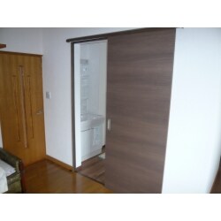 トイレの位置を移動させ、入口を引戸に変更しました。 引戸は建物の柱と干渉してしまう為、アウトセットとしました。 シャワールーム用の脱衣スペースとトイレを共用とすることで、トイレを広いスペースとすることが出来、トイレ使用時のサポートをするスペースの確保をしました。