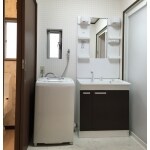 床は木製フロアーではなく耐水性の高いクッションフロアーでしあげましょう。壁・天井もクロス仕上げへ変更。小さい洗面台は洗濯機と洗面台で部屋の幅いっぱいまでとり無駄なスペースをなくしましょう。