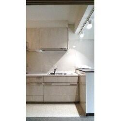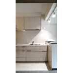 キッチン扉を白っぽく、配管移設し、I型壁付けキッチンに。 カウンターを新規造作し、天井からスポットをお付けいたしました。