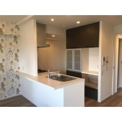 キッチンにピッタリな寸法の収納がほしい。 オープンキッチンなので、見た目も大事。 壁1面だけクロスを貼りたい・・・