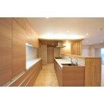 背面の大きいカップボードで収納力を確保し、対面カウンターでリビングと一体になるキッチンスペースにする。