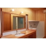 洗面所を広く取り、風通しも考慮して開口部を設けました。また吸放湿出来るよう、壁と天井には木(ピーリング)を使いました。洗面カウンター、洗濯流し、洗濯機が一列に並び、動線もすっきりしました。