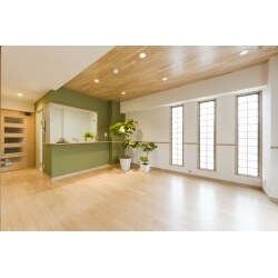 まずアクセントカラーのグリーンのクロスの選定から行いました。落ち着いているけれどもナチュラルな味わいのあるクロスを選びました。それに合わせ、表面の無垢材の風合いがとても良い床材を選びました。天井材も床材と同じ材の木板貼りにすることで、上下の統一感とナチュラル感を演出しました。