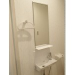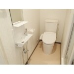 間取り変更をしてユニットバスの前に、脱衣場スペースを設置し、トイレと洗面台を置きました。トイレは、節水6Lタイプですので水道代の節約も期待できます。また、既製品の洗面化粧台だとスペースが大きくなってしまうので、洗面ボウル・鏡・棚を別々に組み合わせてコンパクトでオシャレな洗面化粧台を作りました。