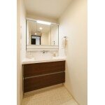 3面鏡の幅が1mの洗面化粧台で収納もたっぷり入る引き出し式の収納にしました。天井のダウンライトを撤去し、化粧台についている照明はLEDになりました。 天板から出ている水栓部分のお手入れの手間を軽減させるために上から出ている水栓を選びました。 洗面室床のクッションフロアも張り替えています。