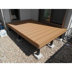 今回ご提案させていたのは、三協立山アルミ『ひととき』という商品でこちらのウッドデッキは、木粉+樹脂で出来たものです。木質感の優しい手触りで耐久性に優れています。定期的な塗り替えは不要で、10年以上色あせの心配なく使用できるものをご提案させていただきました。 木のウッドデッキでは避けられない「ささくれ」がないこと、「色褪せ」も10年以上は無くメンテナンスは難しくないと思います。外でのちょっとした休憩スペースになりそうです。