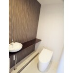 広いトイレでしたので、サイドに手洗いお付けしました。 大胆にアクセント柄をこげ茶で、トイレスペース広いために できる色です。