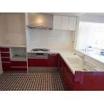 キッチンと家電収納を赤で揃え。吊り戸は白に。 床のクッションフロアもあえての柄を入れ、コーディネート しました。 ご近所に、お友達に自慢したいキッチンになりました。