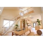 小屋裏部分を活かして吹抜けをつくり、明るく開放的な空間を実現しました。 床、家具、建具には無垢材を使用し、壁、天井を珪藻土で仕上げるなど、素材にこだわり、ナチュラルな雰囲気に仕上がっています。 オーダーの造付家具を配置することにより、施主様の生活スタイルに合わせた収納性能を確保しつつ、内装ともマッチした統一感のある落ち着いた空間になりました。