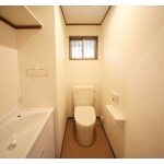 縦に長い間取りが特徴のトイレスペースです。間取りを有効活用し、横向きに設置する手洗器のスペースが広々となっております。