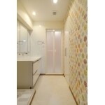 北欧風のアクセントクロスをあしらい、明るく印象的になった洗面スペース。ポップな色を多色使いした北欧風のアクセントクロスが、画一的になりがちな洗面スペースを明るく、楽しい空間にしています。壁面にはリネンを収納できる可動式の棚を設置しました。 浴室内は、浴室暖房乾燥機付きで、浴槽も広々とした開放的な空間に仕上げることが出来ました。