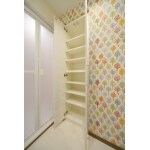 北欧風のアクセントクロスをあしらい、明るく印象的になった洗面スペース。ポップな色を多色使いした北欧風のアクセントクロスが、画一的になりがちな洗面スペースを明るく、楽しい空間にしています。壁面にはリネンを収納できる可動式の棚を設置しました。