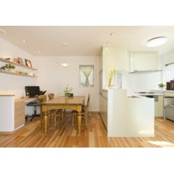 LDKを広々とし明るくし、趣味(フラワーアレンジメントやトールペイント)ができる空間にしたい。キッチンを充実させ、夫婦や来客とのコミニュケーションの場を作りたいというご要望をいただきました。 1階は大空間LDKをご提案し、一角には趣味に没頭できるデスクコーナーを設けています。 また、使い勝手の悪かった水廻り動線を大きく見直し、キッチンからアクセスしやすい間取りに変更しています。 床には国産の杉を用いたフローリングを使用することで、あたたかみのあるスペースに仕上がりました。