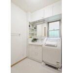 洗面室は、洗濯機置き場と収納スペースも考えて適正なサイズの洗面台をご提案させていただきました。 洗濯機も含め全てを白で統一し、明るく清潔感のある空間に仕上げることが出来ました。
