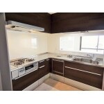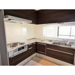 広いスペースを生かし、L型キッチンを、また目線に物が無いように吊り戸をいっぱいまでご提案。 扉色も浴室、トイレを統一感をもたせるブラウンで。 濃い目の色でも、リビングの日差しが入り明るくなり、また狭く圧迫感もなく、高級感があるプランができました。