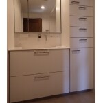 収納重視で、洗面台とキャビネットセットのご提案。 洗濯物、タオルなど外に置く必要がなくなることをアピールいたしました。