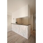 もともと独立していて暗い印象だったキッチンは対面式に変更しました。キッチンへの出入り口の変更に伴い、廊下を短くしています。フルオープンではなく、上部に吊戸棚を設け、収納量を優先したプランにしています。ダイニング側にはお料理や洗い物などを置けるL型のカウンターを取付け、配膳がしやすいようにしています。照明はシーリングライトからすっきりとした印象のダウンライトに変え、明るい空間に変えています。壁には古木調の壁紙を2種類張り分け、アクセントにしています。