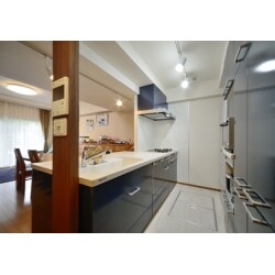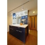 キッチンと吊戸棚の隙間だけがダイニングとつながっているセミクローズのキッチンから、吊戸棚を外したフルオープンキッチンへのリフォームです。 奥行きが深いタイプのキッチンを選び、食器棚もつくりつけにすることで配膳もはかどり収納量も確保できるようご提案しました。 同じ深いブルーの面材をセレクトして、統一感のある空間を心がけました。オープンキッチンになったことで、家族との会話もはずむようになりました。