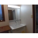 施工後です。 すっきりしたデザインで洗面ボールも大容量です。 三面鏡も使いやすそうですね。