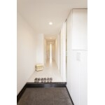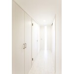 マンションの玄関・廊下は暗めな印象になりがちですが、 床や壁、建具をホワイト系にすることで明るい印象に一変しました。